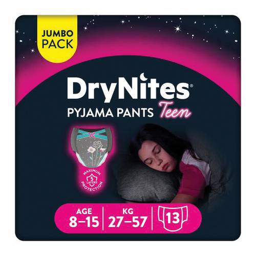 DryNites Pyjama pants Da 8 a 15 anni (da 27 a 57 kg)Descrizione Mutandine usa e getta pensate per offrire alle bambine che stanno diventando grandi, la garanzia di una notte asciutta e serena, grazie al loro lato super assorbente, alle loro morbide fasce laterali super elastiche e ai materia studiati appositamente per renderle comode e discrete, in tutto e per tutto simili alle vere mutandine. Formato Confezione da 13 pezzi. Cod. 02154091